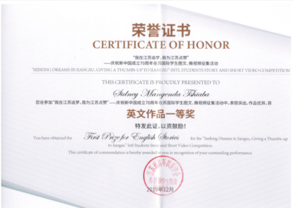 江蘇科技大學積極鼓勵留學生參加創新創業競賽、社會活動、校內外文體活動和比賽,廣泛開展校外交流和展示,獲得一系列獎項與榮譽。留學生參加第五屆中國“互聯網+”大學生創新創業大賽國際賽道獲銅獎一項、全國大學生船舶能源與動力創新大賽獲優秀獎一項、國家外專局跨文化交際大賽獲三等獎一項、江蘇省來華留學生征文大賽一等獎一項……