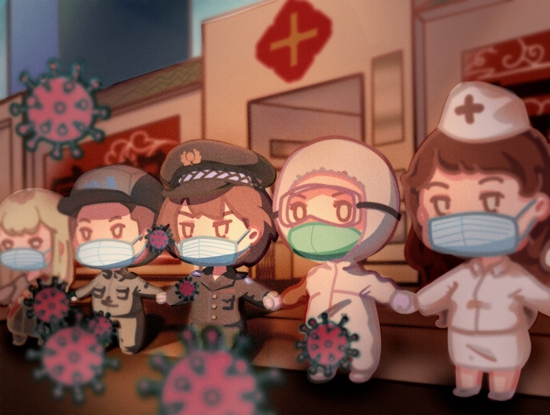 覃思宇和劉思毅兩位共同創作的漫畫作品則體現了在疫情面前,醫護、警察、快遞員及其他各行各業的志愿者們毫不猶豫地投身到抗疫第一線,同心協力、共御病毒的無畏精神。