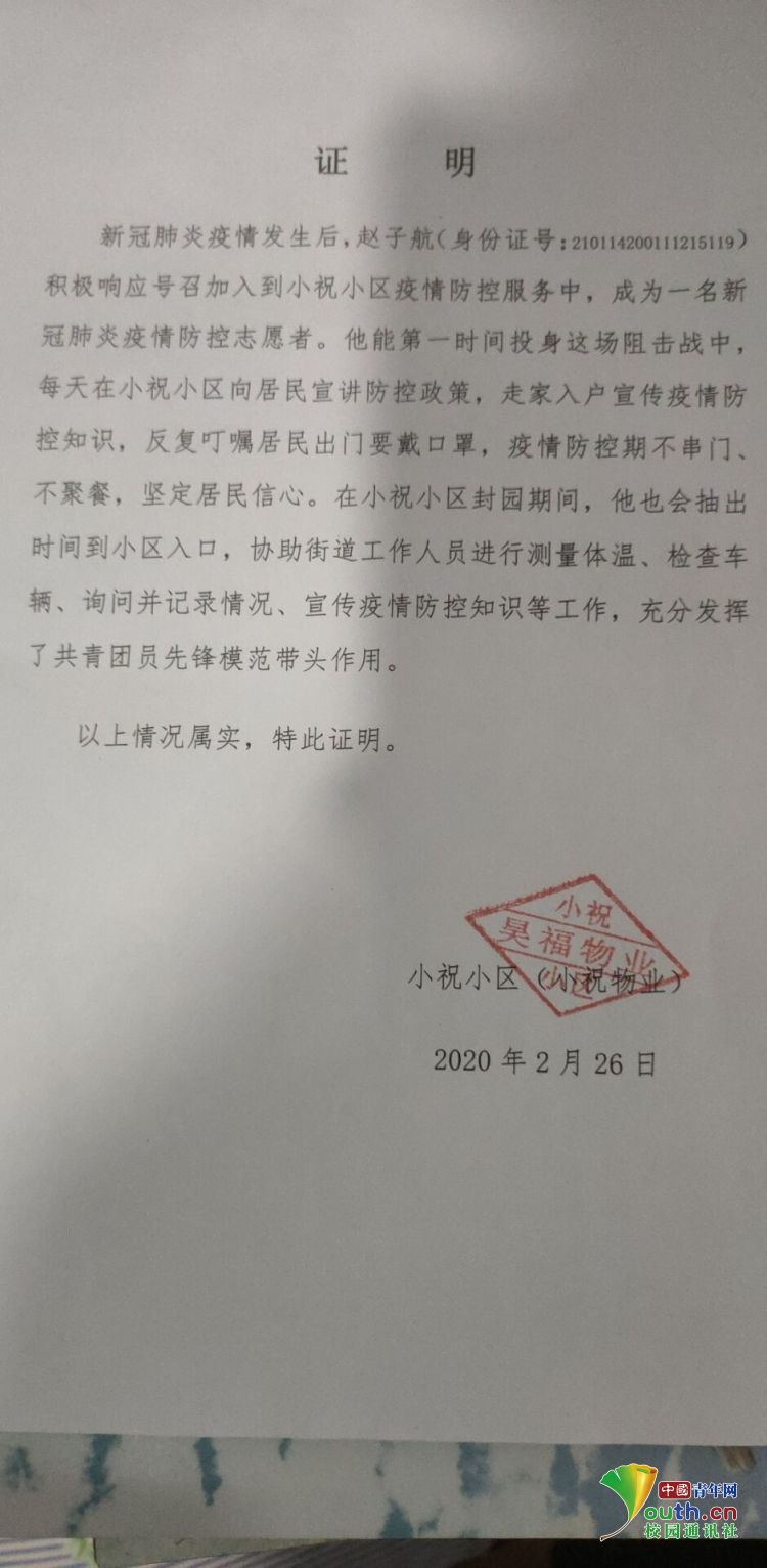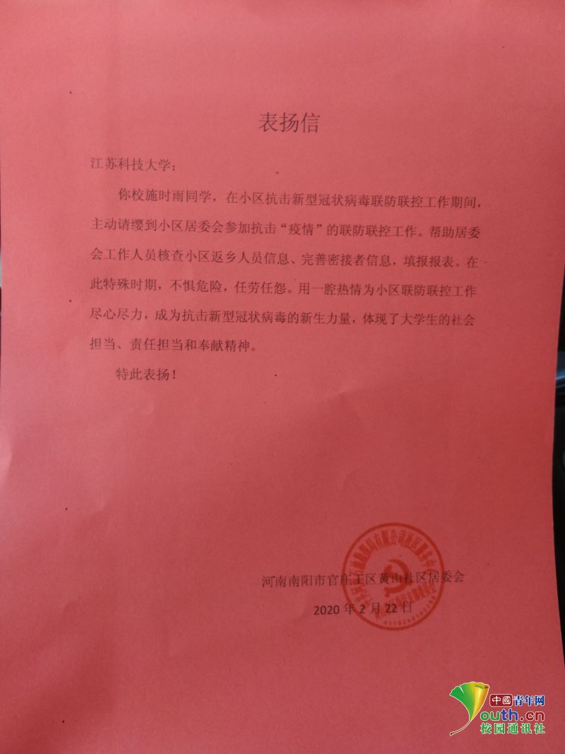 “我們這些‘90’后、‘00’后是在新時代、新環境下成長起來的,也曾被稱為溫室里的花朵,但在這場突如其來的疫情中,我們有責任也有義務為國家做一些事情。”獲得疫情防控工作“先進個人”的施時雨說到。在社區一線做志愿工作的二十多天里,她為社區的防控做出了突出貢獻,榮獲了社區的表彰。表彰信上,社區對施時雨同學積極投身疫情防控工作的精神給予高度贊揚。突出表揚了她在二十多天來連續奮戰,銳意不減,主動犧牲自己的時間,克服工作量大、工作時間長等困難。