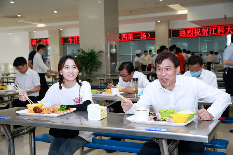 校黨委書記葛世倫與船海學院2018級研究生張一兆、經管學院2018級大二學生柳冰媛、2017級學生賀子高等邊吃邊聊,聊餐廳、聊公交路線、聊社團活動場地、聊未來期許,坦誠交流,面對面解答同學們心中的疑惑,讓大家放心。校黨委書記葛世倫告訴大家,新校區環境更加優美,學習條件、住宿環境都得到了極大的改善,希望大家珍惜學校的資源,本科生要潛心學習,努力掌握必要的知識和技能,研究生要刻苦鉆研,取得更多的學術成果,大家要在江科大追尋自己的夢想,實現自己的目標。