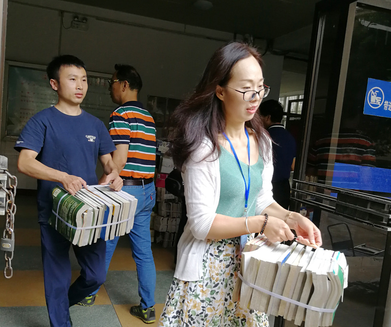 上午九點(diǎn)半,東校區(qū)圖書(shū)館資料運(yùn)送新校區(qū)準(zhǔn)備就位,圖書(shū)館劉維亭館長(zhǎng)帶領(lǐng)留守館員一捆一捆接力搬運(yùn)。新校區(qū)圖書(shū)館使用最新的RFID管理系統(tǒng),能夠?qū)崿F(xiàn)學(xué)生自主借閱,提高了圖書(shū)流通效率,但要實(shí)現(xiàn)該功能需要做好對(duì)新校區(qū)所有入館圖書(shū)重新制作圖書(shū)識(shí)別芯片、系統(tǒng)錄入、上架編排等工作。圖書(shū)館青年同志自發(fā)組成青年突擊隊(duì),擔(dān)任這次搬遷任務(wù)的中堅(jiān)力量,盡心盡力做好每項(xiàng)工作,為搬遷新校區(qū)貢獻(xiàn)自己的力量。青年突擊隊(duì)成員李新英介紹,青年突擊隊(duì)主要由40歲以下在職員工組成,以黨員同志為主。在此次搬遷過(guò)程中,大家以身作則,樹(shù)正氣、聚人心,充分發(fā)揮了黨員模范帶頭作用。