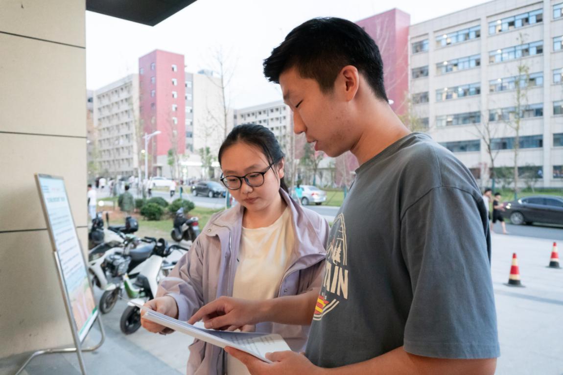 食堂外,00后志愿者們向廣大師生發出倡議書,倡導師生做到節約每一粒糧、每一滴水、每一度電,節約每一張紙,使用“公筷公勺”,低碳出行綠色生活,引領節約用餐良好風尚,倡導文明健康生活方式。