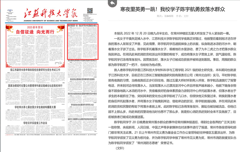 《江蘇科技大學報》作品《寒夜里英勇一跳!我校學子陳宇航勇救落水群眾》(作者:文軒;責編:李巍男)獲文字類二等獎;《江蘇科技大學報》作品《是退役士兵也是抗疫新兵 “老兵防疫特別行動小組”志愿守護“疫”線》(作者:萬旻、謝凌燕、周珂;責編:李巍男)獲文字類三等獎;《江蘇科技大學報》作品《從小竹筏到大輪船》(作者:楊金龍;責編:李巍男)獲副刊類三等獎;江蘇科技大學微信公眾號作品《江科大,是……?》(作者:陶淑琴、李沐軒;責編:王文強、羅文)獲三等獎;江蘇科技大學微博、抖音、快手、視頻號等新媒體作品《盛世華誕,共唱美麗中國!》(作者:張薯云、繆紅銘、常宇航、李家賢、許錚、徐榮晨;責編:王文強)獲三等獎。