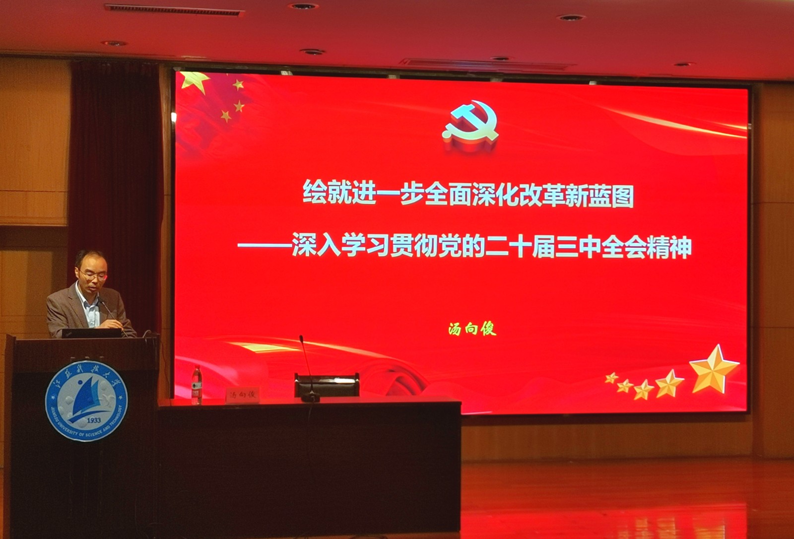 為深入學習貫徹黨的二十屆三中全會精神,10月24日下午,海洋學院黨委、離退休黨工委、繼續教育學院直屬黨支部和海洋裝備研究院直屬黨支部聯合在夢溪校區學術報告廳召開學習貫徹黨的二十屆三中全會精神暨理論學習中心組學習報告會。根據學校黨委統一安排部署,特邀人文學院副院長湯向俊作輔導報告。四部門黨委(黨組)理論學習中心組成員、全體教師黨員和部分學生黨員代表、積極分子代表參加學習。報告會由海洋學院黨委副書記卜江春主持。
