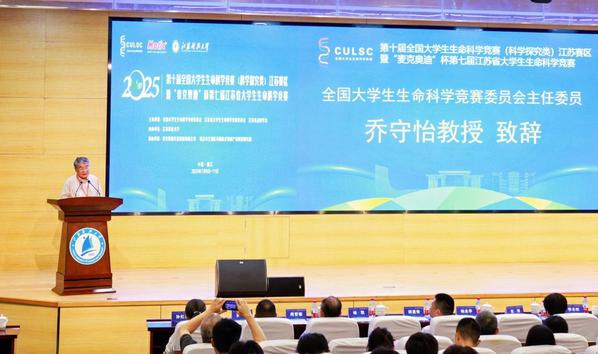 喬守怡向獲獎(jiǎng)團(tuán)隊(duì)表示祝賀,并向我校承辦大賽付出的努力表示衷心的感謝。他表示,全國(guó)大學(xué)生生命科學(xué)競(jìng)賽堅(jiān)守“興趣驅(qū)動(dòng)、科學(xué)研究、能力提升”的初心,為在校大學(xué)生搭建連接夢(mèng)想與實(shí)踐、探索與創(chuàng)新的橋梁,他鼓勵(lì)青年大學(xué)生“弘揚(yáng)科學(xué)精神,勇攀生命科學(xué)高峰”。江蘇省大學(xué)生生命科學(xué)競(jìng)賽監(jiān)督委員會(huì)主任、南京大學(xué)華子春教授作大賽總結(jié)發(fā)言。