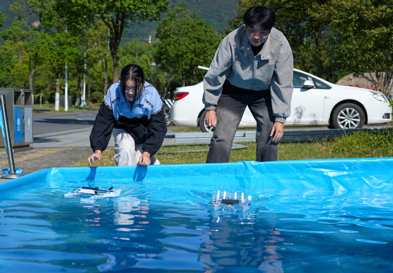 本次活動恰逢臨近學校校慶,青年大學生們在自制的船模空白處寫下一句句對學校的真摯祝愿。座談結束后,還舉行了思政領航館首場大學生科創活動——帆船競速比賽,現場氛圍熱烈。