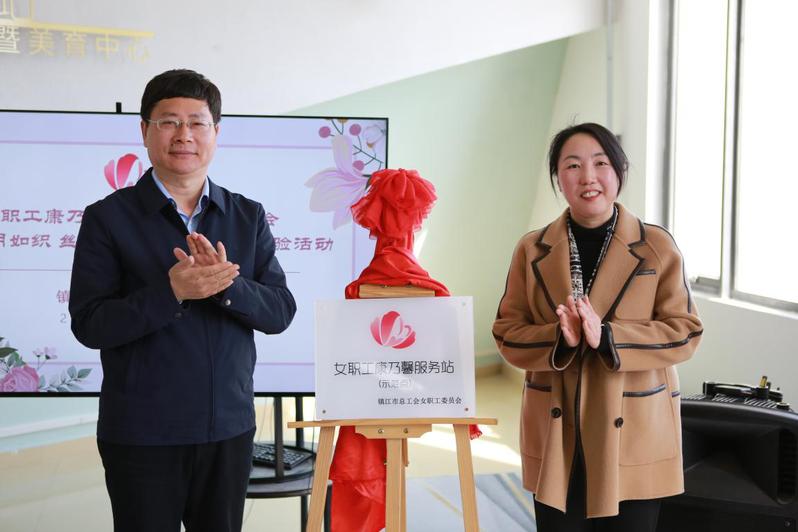 在當天下午的交流活動現場,江蘇科技大學黨委常委、副校長潘錦全與鎮江市總工會女職工部部長金茜共同為江科大女職工康乃馨服務站市級示范點揭牌。