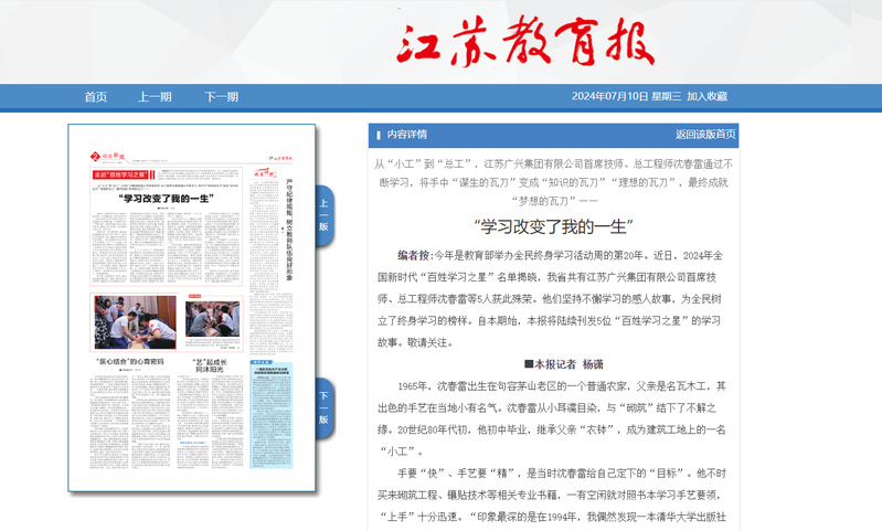 編者按:今年是教育部舉辦全民終身學習活動周的第20年。近日,2024年全國新時代“百姓學習之星”名單揭曉,我省共有江蘇廣興集團有限公司首席技師、總工程師沈春雷等5人獲此殊榮。他們堅持不懈學習的感人故事,為全民樹立了終身學習的榜樣。自本期始,本報將陸續刊發5位“百姓學習之星”的學習故事。敬請關注。