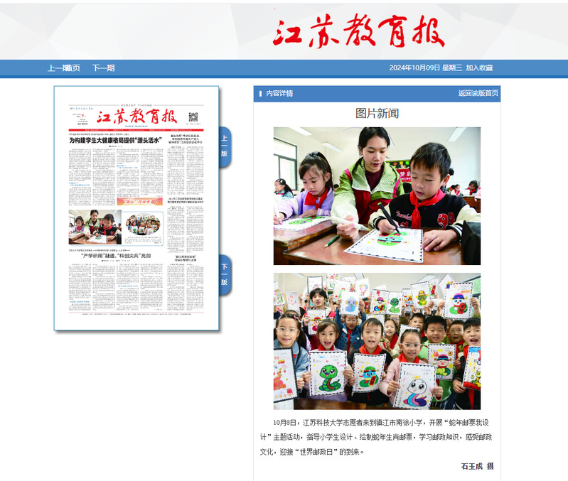 10月8日,江蘇科技大學志愿者來到鎮江市南徐小學,開展“蛇年郵票我設計”主題活動,指導小學生設計、繪制蛇年生肖郵票,學習郵政知識,感受郵政文化,迎接“世界郵政日”的到來。