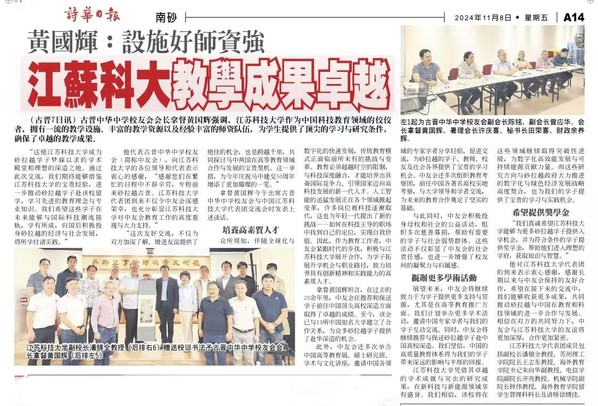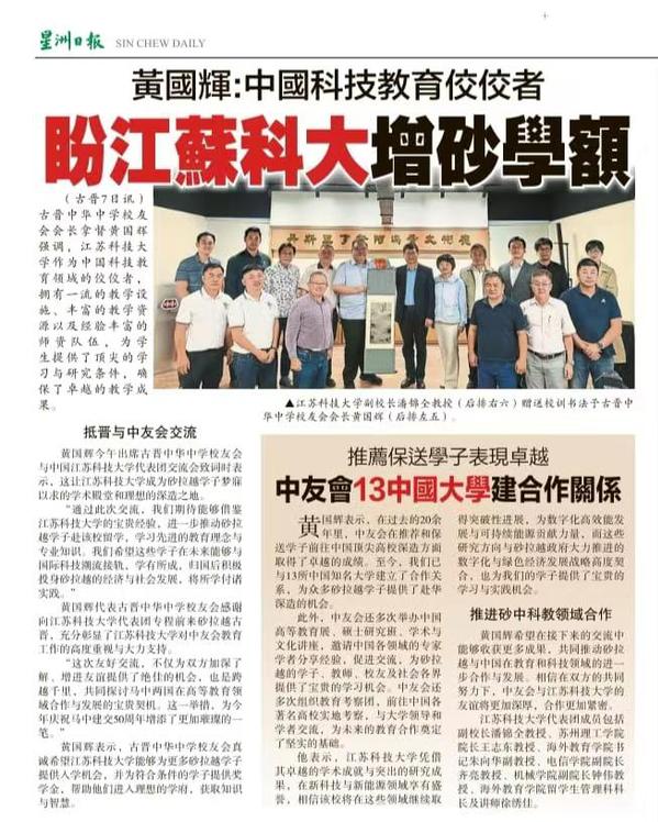 (古晉7日訊)古晉中華中學(xué)校友會(huì)會(huì)長(zhǎng)拿督黃國(guó)輝強(qiáng)調(diào),江蘇科技大學(xué)作為中國(guó)科技教育領(lǐng)域的佼佼者,擁有一流的教學(xué)設(shè)施、豐富的教學(xué)資源以及經(jīng)驗(yàn)豐富的師資隊(duì)伍,為學(xué)生提供了頂尖的學(xué)習(xí)與研究條件,確保了卓越的教學(xué)成果。